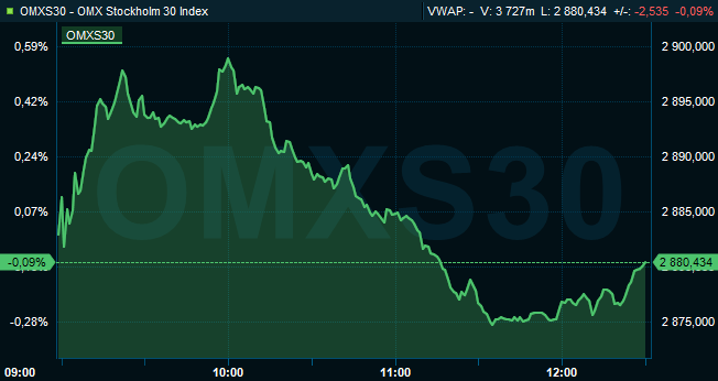 STOCKHOLM (Nyhetsbyrån Direkt) Stockholmsbörsen var ned något vid lunchtid på fredagen, men storbolagen Saab och Munters steg mot strömmen efter att båda ha meddelat miljardordrar under nyårshelgen. Storbolagsindexet OMXS30, som har stigit under de föregående sex handelsdagarna trots sjunkande USA-börser i slutet av fjolåret, var vid 12.30-tiden ned 0,1 procent till nivån 2.880. Aktier för knappt 6 miljarder kronor hade då omsatts på Stockholmsbörsen. Munters lyfte 9 procent efter en ny amerikansk order värd 2,1 miljarder kronor inom datacenterområdet. Investmentbanken Pareto känner sig tryggare över sina tillväxtestimat för klimatkontrollbolaget efter storordern. Saab handlades upp 4 procent med stöd av en order från Litauen värd 3 miljarder kronor på korträckviddiga luftvärnsrobotar inom affärsområdet Dynamics, som är det affärsområde som har högst rörelsemarginal i försvarsbolaget. "Ordern från Litauen är den hittills största på Bolide-robotar till RBS 70-systemet", uppger Jenny Gerdes vid Saabs pressavdelning för Nyhetsbyrån Direkt. Gruvbolaget Boliden stärktes 2 procent. Metallpriserna pekade uppåt på fredagen, främst på ädelmetallsidan. I gruvsektorn steg Lundin Gold 1 procent och Viscaria 4 procent. Stålbolaget SSAB klättrade 4 procent. Banken BNP Paribas Exane har höjt sin riktkurs till den högsta i hela analytikerkåren, rapporterade Dagens industri. Svagare gick det för teknikhandlaren Addtech och industrikonglomeratet Lifco som tappade 3 procent. Kraft- och automationsföretaget ABB och mätteknikbolaget Hexagon var också ned runt 2 procent. Skanska var däremot upp något med stöd av flera byggorderbesked i USA. Arlandastad sjönk 5 procent efter att Per Taube, som är ledamot och största ägare via Gelba Management, sålt aktier i fastighetsbolaget för drygt 155 miljoner kronor. Pareto gör sju förändringar i sin aktieportfölj inför 2026 års handel. Bland dem steg W5 Solutions, som tar plats i portföljen, med 9 procent. Netel fortsatte upp 12 procent efter att ha stigit 22 procent i fredags när bolaget omförhandlade sin finansiering. Bioteknikbolaget Bio-Works inledde året med att släppa preliminära siffror för det fjärde kvartalet. Orderingången ökade till nästan 26 miljoner kronor (6) med en försäljning som accelererade till nästan 24 miljoner kronor (3). Aktien ställdes upp 8 procent. Graf: OMXS30 fredagen den 2 januari Källa: Infront